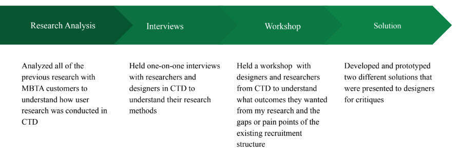 The first deliverable were a collection of resources across the MBTA departments that would allow the CTD team to recruit participants reflective of the greater Boston Area. Resources included a list of community organizations willing to share with their members and a recruitment form specifically for the MBTA’s Department of System-Wide Accessibility (SWA).